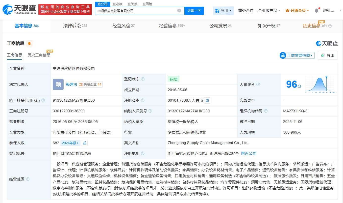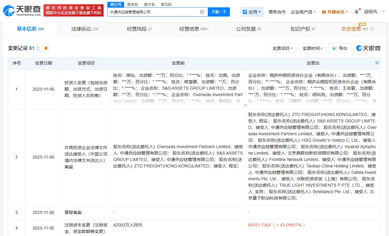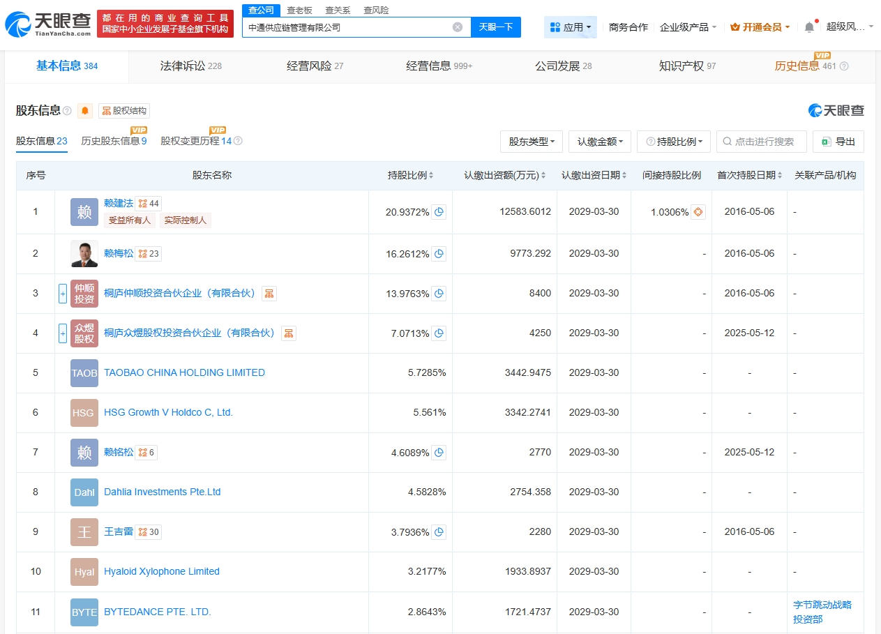 每经AI快讯,天眼查App显示,近日,中通供应链管理有限公司发生工商变更,新增BytedancePte.Ltd.、TAOBAOCHINAHOLDINGLIMITED等为股东,同时注册资本由4.2亿元人民币增至约6亿元人民币,增幅约43%。该公司成立于2016年5月,法定代表人为赖建法,经营范围含供应链管理服务、企业管理、普通货物仓储服务等。股东信息显示,该公司由赖建法、赖梅松及上述新增股东等共同出资。